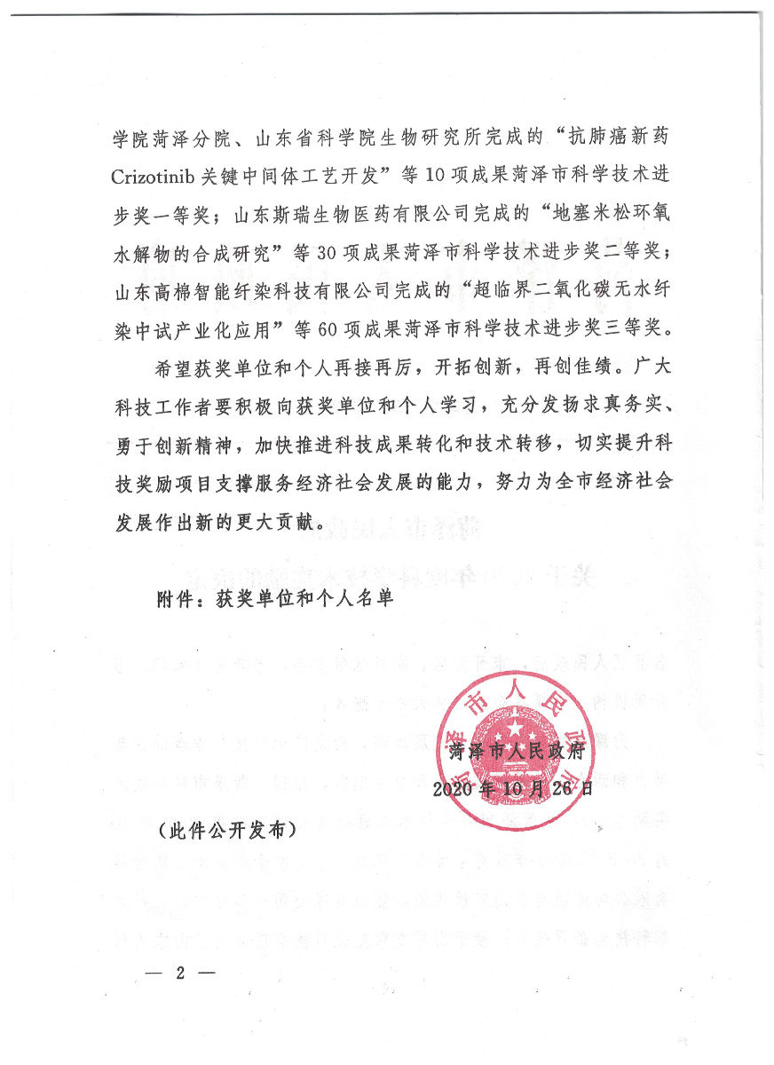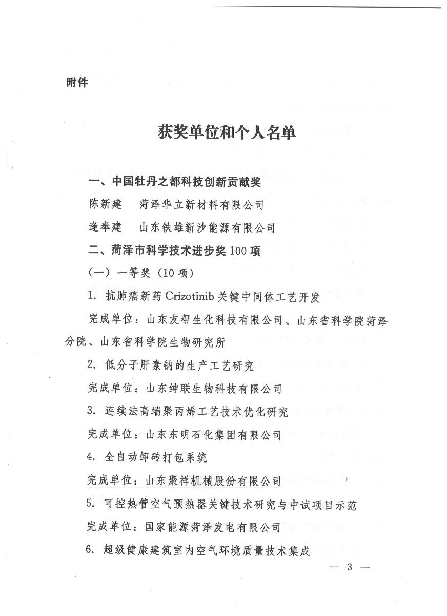 聚祥全自動卸磚打包機(jī)被評為菏澤市科學(xué)技術(shù)一等獎